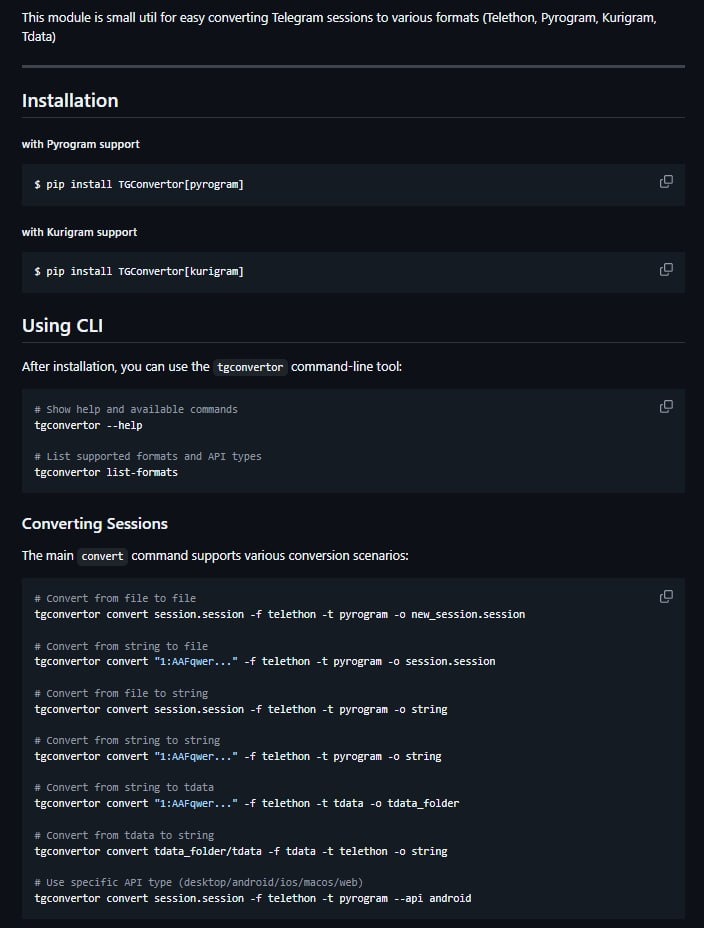 , Pyrogram, Kurigram и TDATA (формат Telegram Desktop) — легко, быстро и через удобный интерфейс командной строки. 📌 Основные особенности: 🔵Конвертация сессий Telegram между Telethon, Pyrogram, Kurigram и TDATA 🔵Поддержка работы как с файлами сессий, так и со строковыми сессиями 🔵Удобный CLI-инструмент для использования из терминала 🔵Python API для встраивания в собственные проекты 🔵Просмотр информации о сессии без конвертации 🔵Поддержка обратимых преобразований между форматами ➡️ Установка с поддержкой pyrogram: pip install TGConvertor[pyrogram] ➡️ Установка с поддержкой kurigram: pip install TGConvertor[kurigram] 📱 Репозиторий ➡️Справочник Программиста. Подписаться