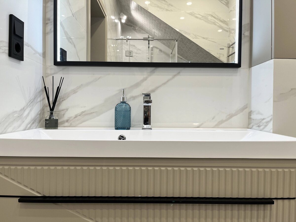 Единая концепция дизайна с индивидуальной фрезеровкой по задумке-проекту клиента. Опираясь на общий дизайн дома - отличное решение изготовить мебель в ванную на заказ. ✅ Тогда ваша ванная точно будет гармонично смотреться с интерьером. #дом_мебель