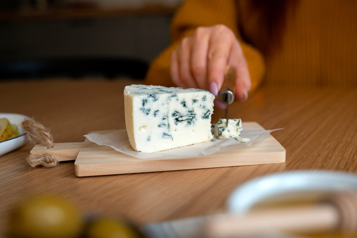 Многим интересно, как правильно есть сыр с плесенью, и особенно — голубые сорта, потому что у них более яркий характер и насыщенный вкус. Чтобы такой сыр раскрылся полностью, дайте ему «согреться»: достаньте из холодильника за 30–60 минут до подачи. При комнатной температуре аромат становится глубже, а вкус — мягче и объемнее, без резкости.