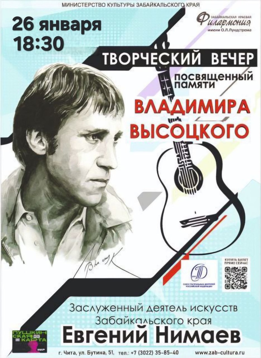 Сегодня состоится творческий вечер Евгения Нимаева Заслуженный деятель искусств Забайкальского края посвятит эту встречу творчеству Владимира Высоцкого 🕐26 января, 18:30 📍Забайкальская краевая филармония 🔑справки по телефону: 35-85-40 #Новости Предложить публикацию:@zabkulisye_bot
