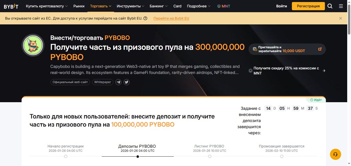 💻 Что делать? ➡️ Регистрация на Bybit 🟠 TS PYBOBO Для новых Делаем депозит 100 и объем 100 Награда: 40,000 PYBOBO (~34.16$) Листинг: 26.01 10:00 UTC Мест: 2,500 🟠 Торговое задание PYBOBO Для всех Получи до 1,500,000 из пула 200,000,000 Мини. объем: 500 USDT 🟠 Торговое задание Alpha PYBOBO Для всех Получи до 2,000,000 из пула 150,000,000 Мини. объем: 500 USDT 👉 Купить кус можно в NVS SHOP 👉 Прокси беру на proxyline промо AllWin 👉 Антидетект браузер ADS промо на 5% ALLWIN5 ❕ Гайд по созданию фермы