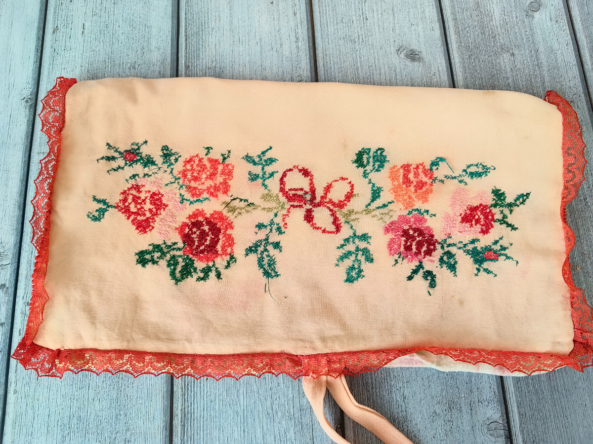При разборе шкафа попалась мне не только блузка с вышивкой Ришелье, но и небольшое саше (ударение на последний слог). Это саше тоже память о моей бабушке, она его и сшила, и вышила Рисунок она брала скорее всего с журнала "Крестьянка", нежные розочки. Конечно, нитки подбирались, просто сравниваясь с рисунком схемы. Вышивала крестом, ткань шёлковая. Для вышивки использовала специальную выдёргивающуюся канву. Такие саше она вышила не только мне, но и маме. Мамино саше чуть-чуть отличается от моего, розочки немного другие, кружево разное, и она им пользуется до сих пор, все её носовые платки находятся в нём. А внутри они совершенно одинаковые Мулине бабушка использовала обычное, которое тогда продавалось - это мулине ПНК им. Кирова. Как я уже сказала, мама пользуется своим саше постоянно, а вот я его убрала на хранение, но не пустое, в нём у меня хранятся вышитые носовые платочки, свидетели тех давних лет. Первая группа платочков - это платочки, которые когда-то вышивала я, давным-д