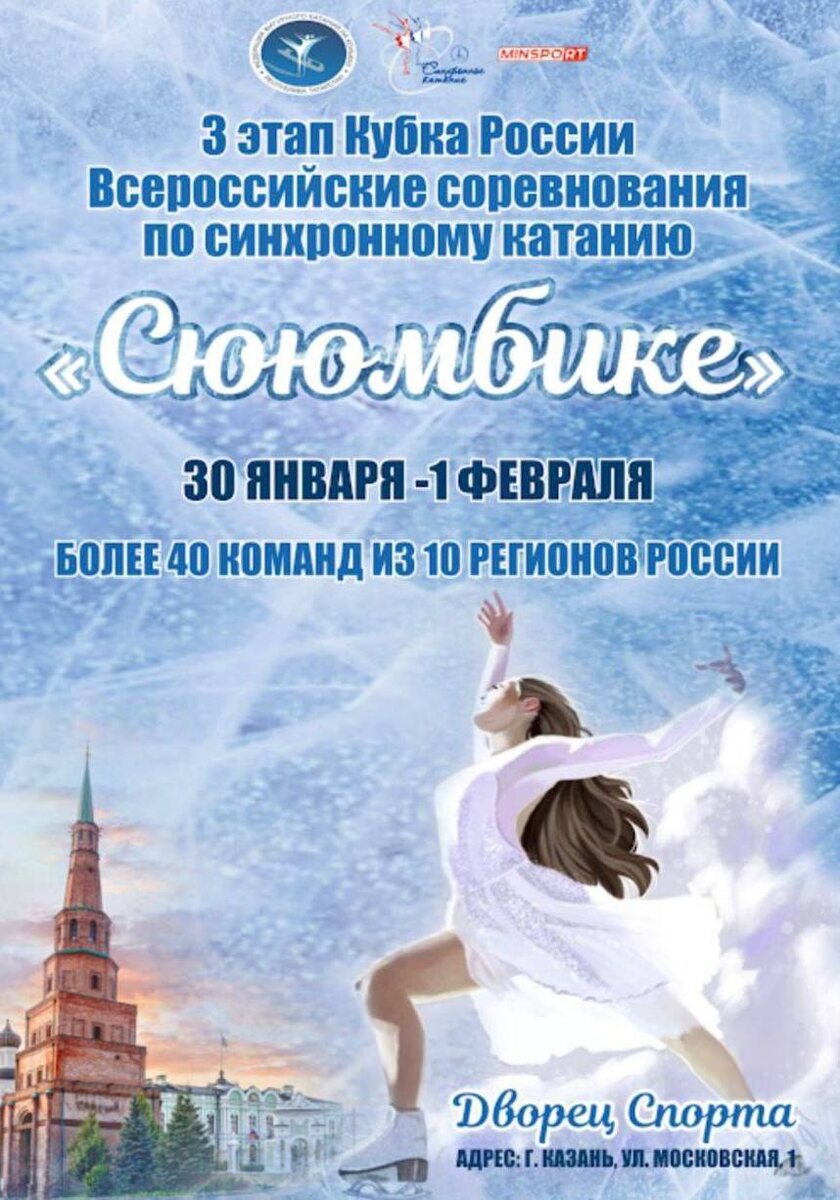 Сююмбике Они являются отборочными соревнованиями к Чемпионату и Первенству России по синхронному катанию. В соревнованиях примут участие 50 команд из 19 регионов России. Синхронное катание, самая молодая из дисциплин фигурного катания, зародилась в 1956 году. Выступления команд выглядят захватывающе! На льду одновременно находятся от 12 до 16 спортсменов, выполняя различные элементы фигурного катания, перестроения и поддержки! Широкое распространение этот вид спорта получил в 70-х годах в Канаде, США, Швеции, Финляндии, Англии, Франции. В 1976 году в Мичигане были проведены первые официальные международные соревнования между канадской и американской командами. В России командные выступления стали практиковаться с 20-х годов прошлого столетия. Первые состязания по дисциплине в стране были проведены в 1991 году. Билеты 📍30 января - 1 февраля