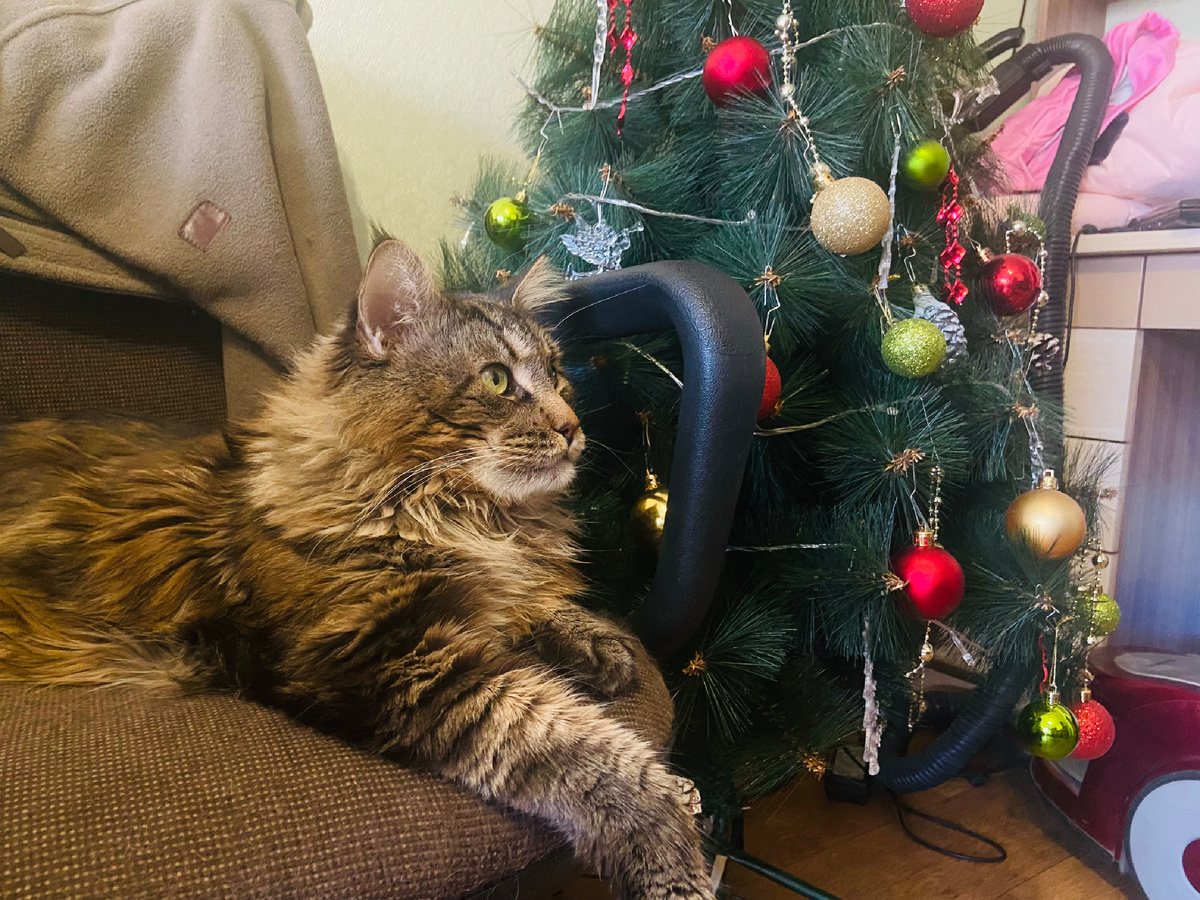 Сегодняшняя сцена - зал. Самая большая комната в квартире № 89. 31 декабря 2025 года оставил здесь след: небольшую искусственную елочку. Старенькую, две секции, 150 см в высоту. Украшенную разноцветными шарами, прозрачными сосульками и золотой звездой на макушке. Самый любимый арт-объект кота Гаврилы.