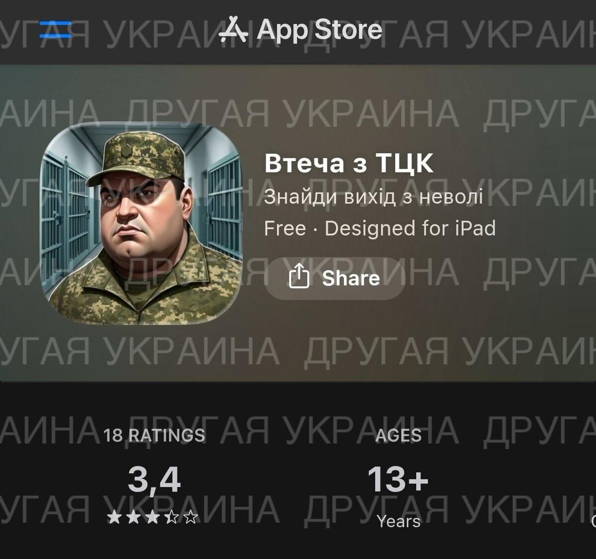 В магазинах App Store и Google Play состоялся релиз игры под красноречивым названием «Втеча з ТЦК» (Побег из ТЦК). Мобилизация в игре представлена в жанре симулятора побега из тюрьмы строгого режима от первого лица. Игроку предстоит примерить на себя роль «заключенного» системы и освоить все прелести подпольной жизни. Первые пользователи в комментариях иронизируют, что игра «сырая» и полна багов. Впрочем, другие шутят, что баги в игре — это самая реалистичная часть. Сайт "Другая Украина" / Telegram / Вконтакте / Центр поддержки Украинцев / Жалоба на ТЦК "Другая Украина" теперь в МАХ