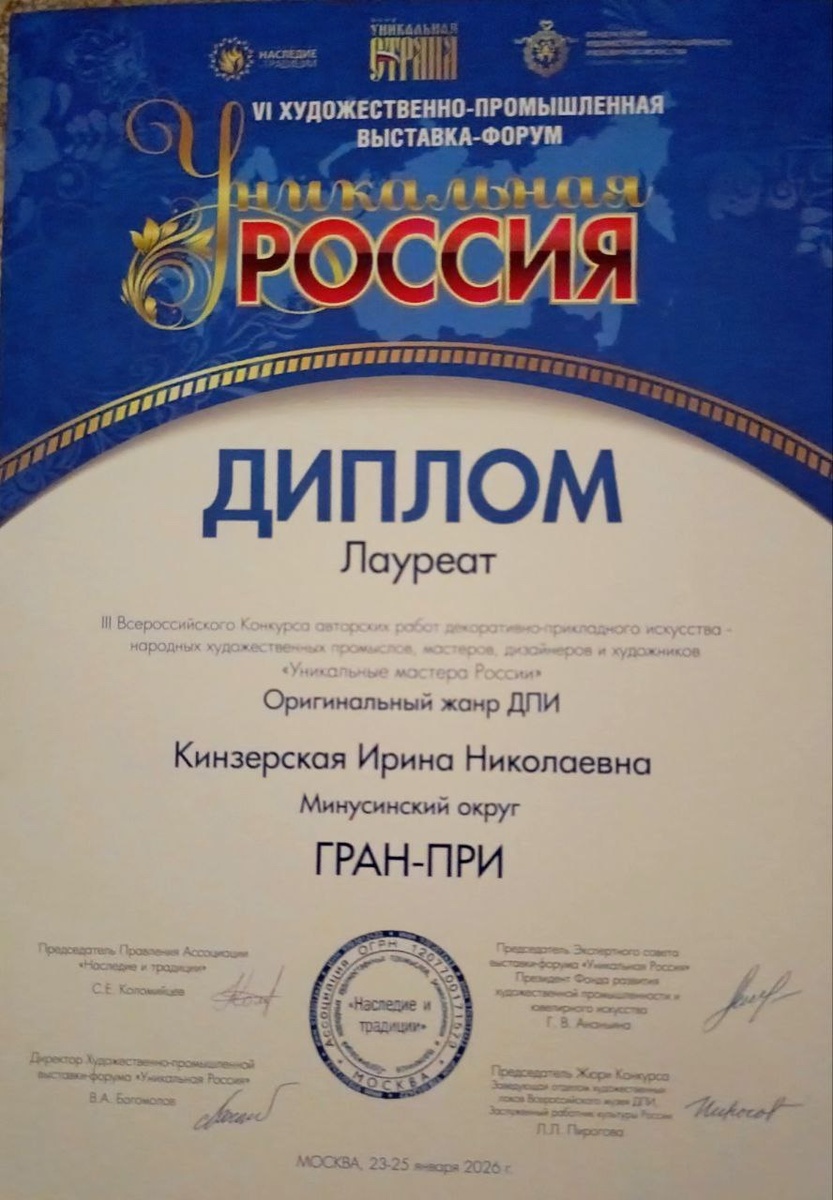 «Уникальные мастера России» в номинации «Оригинальный жанр декоративно-прикладного искусства». За этой победой – годы работы, сотни проб и поисков, упорство, внимательность к каждой детали. Работы Ирины Николаевны узнаются сразу: в них есть характер, внутренняя логика, смелость делать по-своему и не оглядываться на моду. Для минусинцев это особая история. Потому что речь идёт о человеке, которого мы знаем, видим каждый день, чьё мастерство выросло здесь, рядом. И сегодня его ценят на российском уровне. Гордимся Ириной Кинзерской. И очень хочется, чтобы таких новостей о наших мастерах становилось больше.