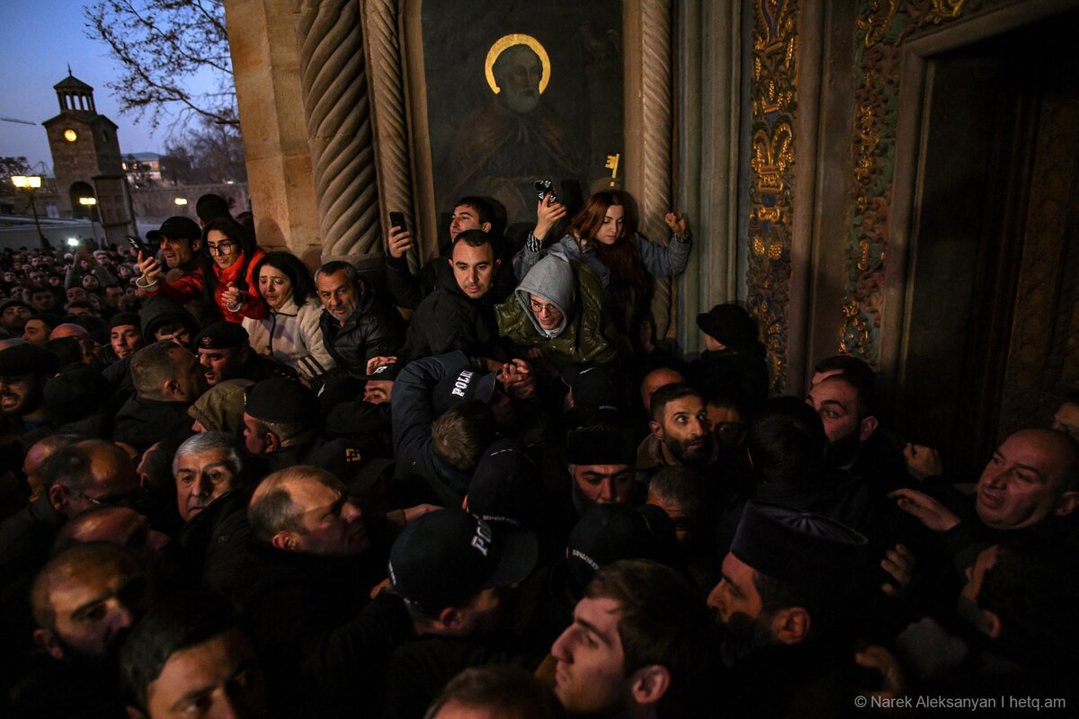 18 декабря вандалы с партбилетами ГД рука об руку с беспартийными адептами Пашиняна колотили ногами по двери, ведущей в центральный собор Святого Эчмиадзина. За дверью проходило богослужение. ВАРВАРЫ ПЫТАЛИСЬ ВЫЛОМАТЬ ДВЕРЬ, КОТОРАЯ ЯВЛЯЕТСЯ УНИКАЛЬНЫМ ОБРАЗЦОМ ЦЕРКОВНОГО ЗОДЧЕСТВА. В тот же день правительство под руководством главного подстрекателя к нападкам на Католикоса Всех Армян Гарегина Второго приняло решение о выделении из фонда министерства образования, науки, культуры и спорта 175 млн 360 тыс. драмов. Сумма предназначалась на покупку раритетного фрагмента дверной створки, изготовленной в 1188 г. Раритетное изделие выставлено на международном аукционе в Лондоне. Подобные фрагменты ранее уже становились достоянием исторической сокровищницы РА главным образом в виде образцов деревянного церковного зодчества. Речь о резьбе на деревянных дверях, ведущих в соборные помещения. Упомянутый раритет в настоящее время хранится в лондонской галерее Сэма Фога. Галерея потре