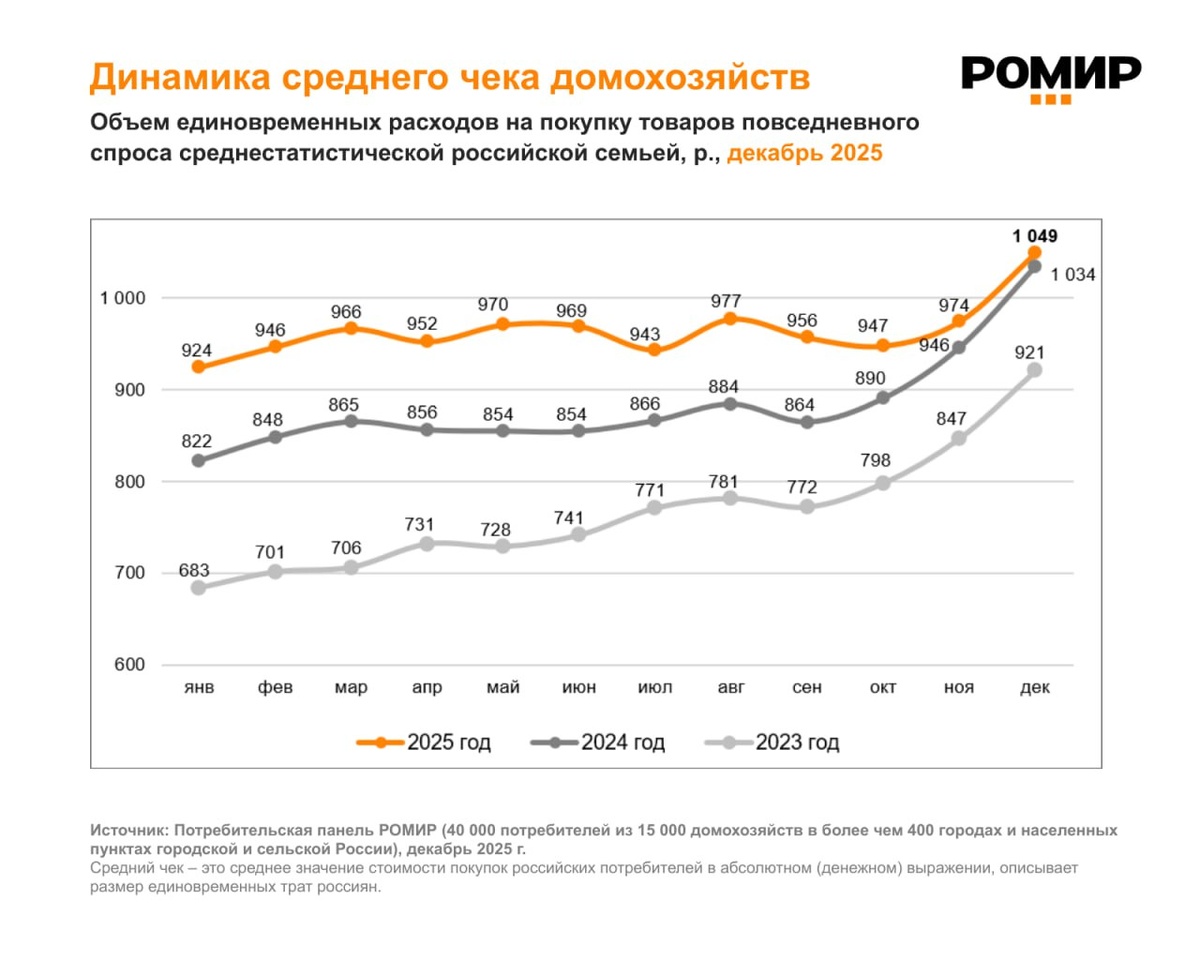 составил средний чек российского жителя в 2025 году (рост к 2024 году +9,4%, или 83 руб.). «Средний чек» — это показатель, отражающий среднюю единовременную стоимость покупок российских потребителей в абсолютном (денежном) выражении. Расчет производится ежемесячно на базе Потребительской панели РОМИР (40 000 россиян из 15 000 домохозяйств в более чем 400 городах и населенных пунктах городской и сельской России, репрезентирующих покупательское и потребительское поведение жителей всей страны). Подробные данные за декабрь 2025 года: 🔸 Согласно данным Потребительской панели РОМИР, в декабре 2025 года средний чек российского жителя составил 1049 руб. 🔸 По сравнению с ноябрем 2025 года размер среднего чека увеличился на 7,7% (или на 75 руб.); относительно декабря 2024 года показатель продемонстрировал рост на 1,4% (или на 15 руб.). «По данным исследования РОМИР, средний чек российского потребителя за один поход в магазин в декабре 2025 года вырос на +7,7% по сравнению с ноябрём. Хо