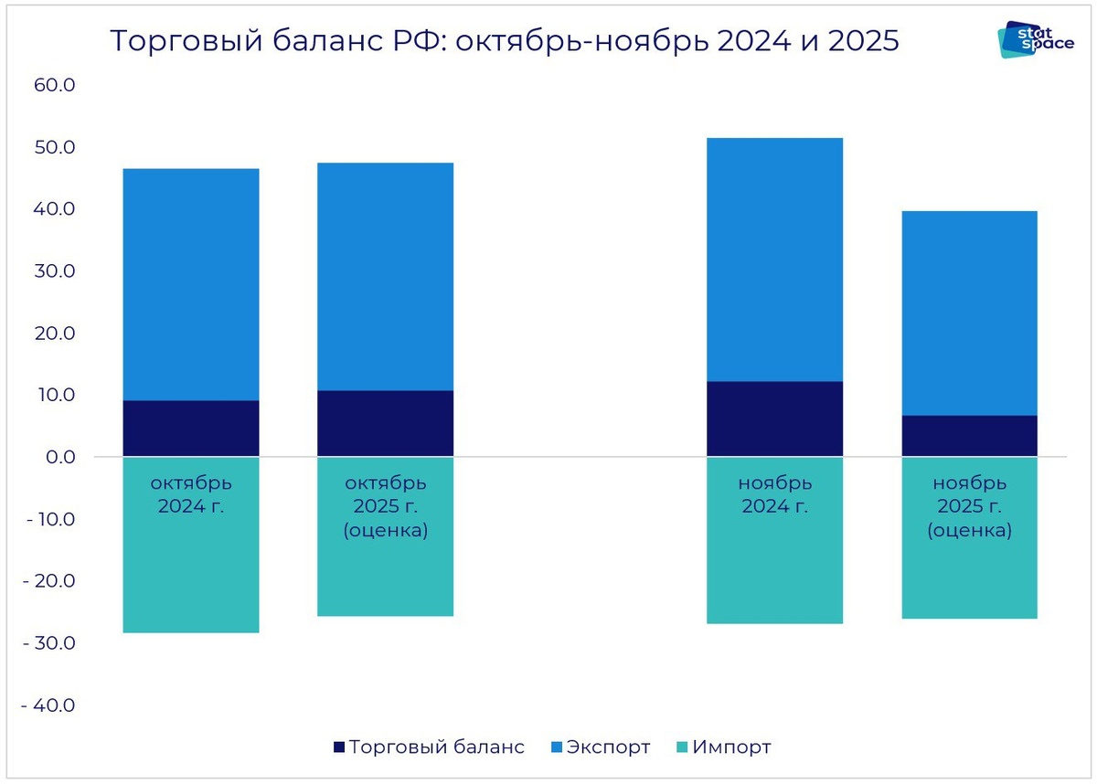 Сальдо торгового баланса РФ в ноябре 2025, по оценкам ЦБ, снизилось до +6.8 млрд долларов (против +10.8 в октябре 2025 и +12.3 в ноябре прошлого года!). Одновременно с этим происходит и снижение импорта: на 0.8 млрд долларов по сравнению с прошлым годом (экспорт же снизился на 6.3 млрд). В целом, сальдо счёта текущих операций в ноябре составило +2 млрд долларов - против +7.8 в ноябре прошлого года, суммарное же сальдо за первые 11 месяцев года упало с 59.9 млрд до 38.1. А ещё - какая-то магия творится с чистыми ошибками и пропусками: в ноябре они составили -5.1 млрд долларов, суммарно же за январь-ноябрь 2025 они составили -20.3 млрд (больше половины всего сальдо счёта текущих операций!)