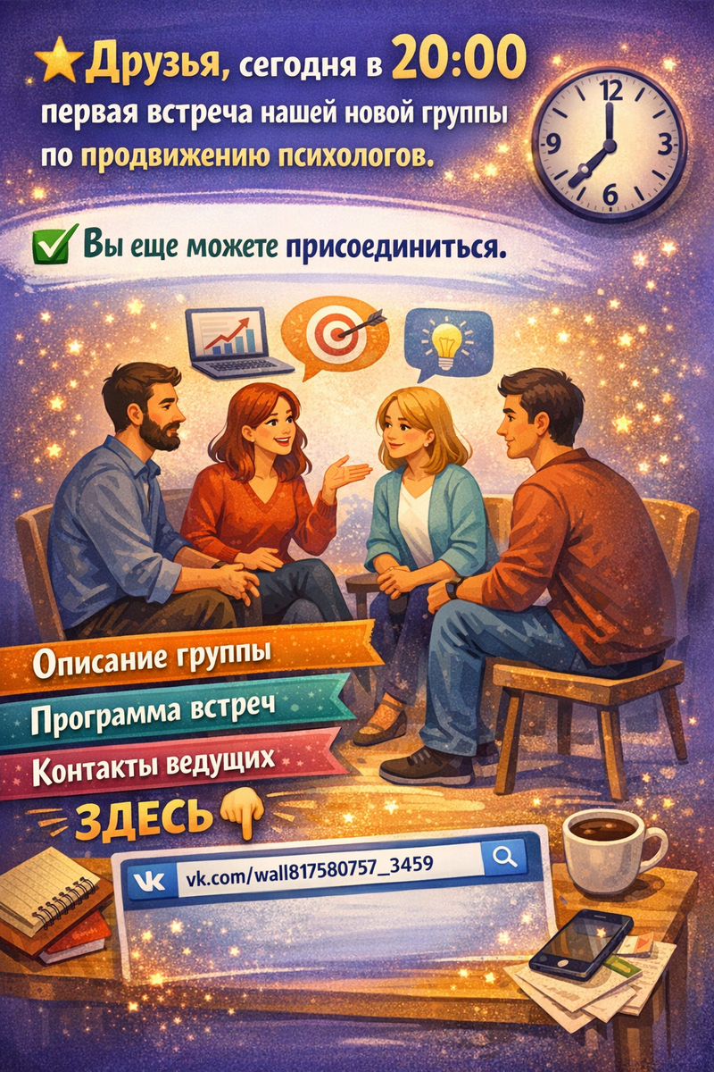 Сегодня, в 20:00 по московскому времени, состоится первая, установочная встреча нашей новой группы по продвижению для психологов, психотерапевтов и коучей. Это не очередной вебинар с обещаниями «миллиона клиентов за неделю». Это начало живого, практического сообщества, где мы будем учиться друг у друга, поддерживать и вдохновлять, находить ответы на самые сложные вопросы частной практики.