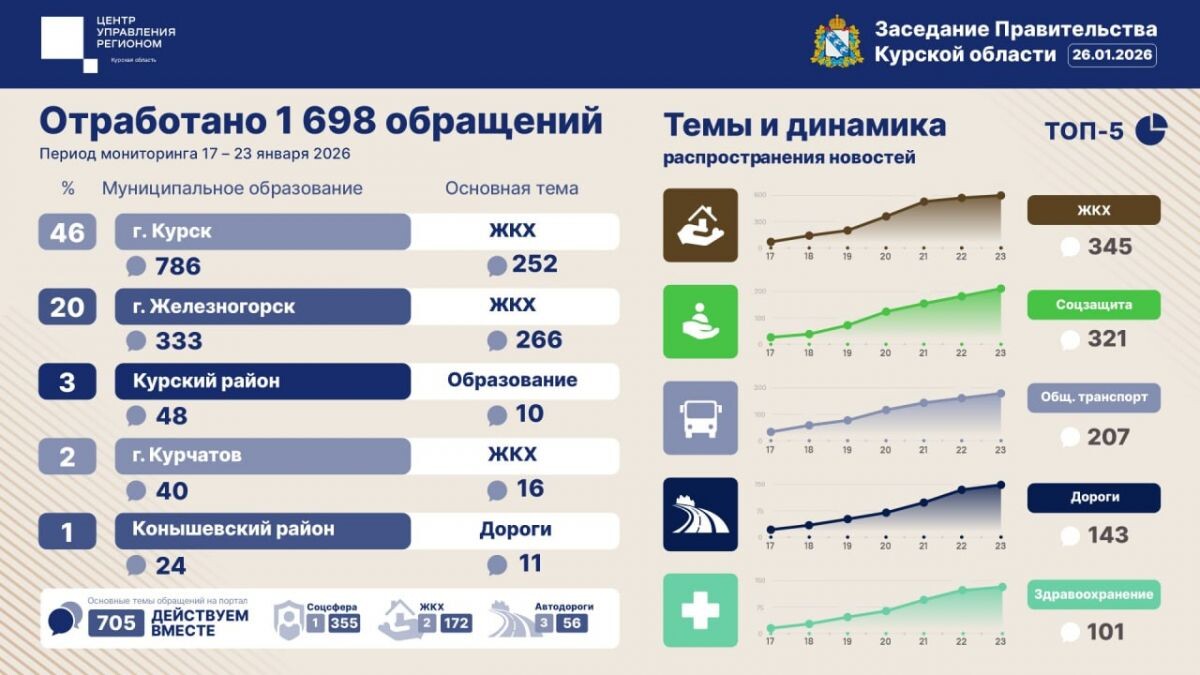 Качество коммунальных услуг и работа общественного транспорта остаются наиболее острыми проблемами для жителей Курской области. Такие данные следуют из еженедельного анализа обратной связи, представленного на заседании регионального правительства. С 19 по 25 января специалисты Центра управления регионом (ЦУР) отработали 1698 обращений. Наибольшее число жалоб поступило из Курска (46%) и Железногорска (20%). Ключевые проблемы: