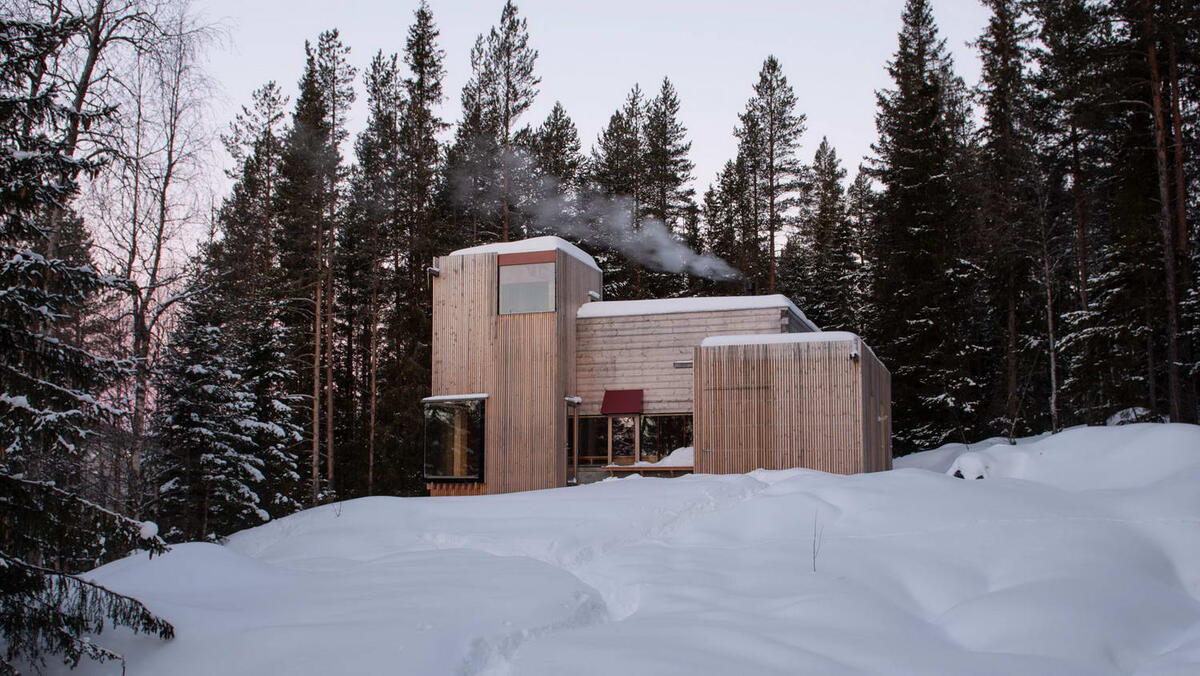 Норвежская студия Gartnerfuglen Arkitekter завершила строительство дома под названием Arestua (бревенчатая хижина) в отдаленном лесном районе, отсылая к традиционным бревенчатым домам, чтобы создать ощущение «естественного минимализма». Домик стоит на небольшой наклонной лесной поляне и берёт своё название от норвежского слова, обозначающего бревенчатую хижину, которая исторически была построена вокруг открытого огня. Опираясь на эти традиции, студия разделила дом на пять объёмов, создав четыре «надворные постройки», организованные вокруг освещённой центральной жилой зоны с камином. Между объёмами размещены небольшие открытые пространства со скамейками, с которых открывается вид на окружающий пейзаж. «То, как расположены объёмы здания, обеспечивает различные защищённые пространства со всех сторон, каждое из которых имеет свои собственные качества, — рассказала соучредитель студии Астрид Роде Ванг. — Мы хотели, чтобы центральное пространство имело своего рода величие с высоким потолко