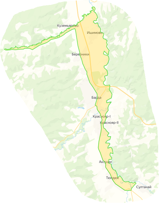 Участок 1 Северная граница - от пересечения дороги Кудаш - Юкшур с рекой Большая Амэя, далее по реке Большая Амэя до реки Тулва Восточная граница - по реке Тулва до населенного пункта Усть-Ашап Южная граница - через населенный пункт Усть-Ашап по улице Ленина до дороги Барда - Куеда Западная граница - от пересечения улицы Ленина населенного пункта Усть-Ашап и дороги Барда - Куеда через населенный пункт Старый Ашап до поворота перед выездом из населенного пункта Старый Ашап, далее по дороге Барда - Куеда до улицы Ленина населенного пункта Барда, далее по улице Ленина населенного пункта Барда до населенного пункта Мостовая, далее по дороге до населенного пунта Березники, далее по дороге до поворота на населенный пункт Кудаш, далее по дороге до населенного пункта Кудаш, далее по дороге до реки Большая Амэя Участок 2 Северная граница - от реки Сарашка по реке Тулва до дороги Сараши - Брюзли Восточная граница - по дороге Сараши - Брюзли до пересечения с дорогой Сараши - Танып Южная граница -