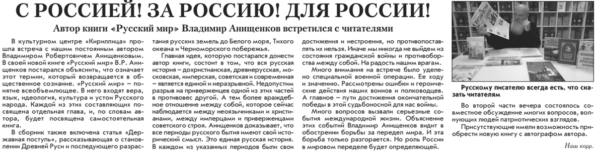 Книгу "Русский Мир" представил читателям в культурном центрее Кириллица. Саму книгу можно приобрести там же. Адрес: Нижняя Красносельская, дом 40/12, корпус 17. Телефон 8-925-543-87-93.