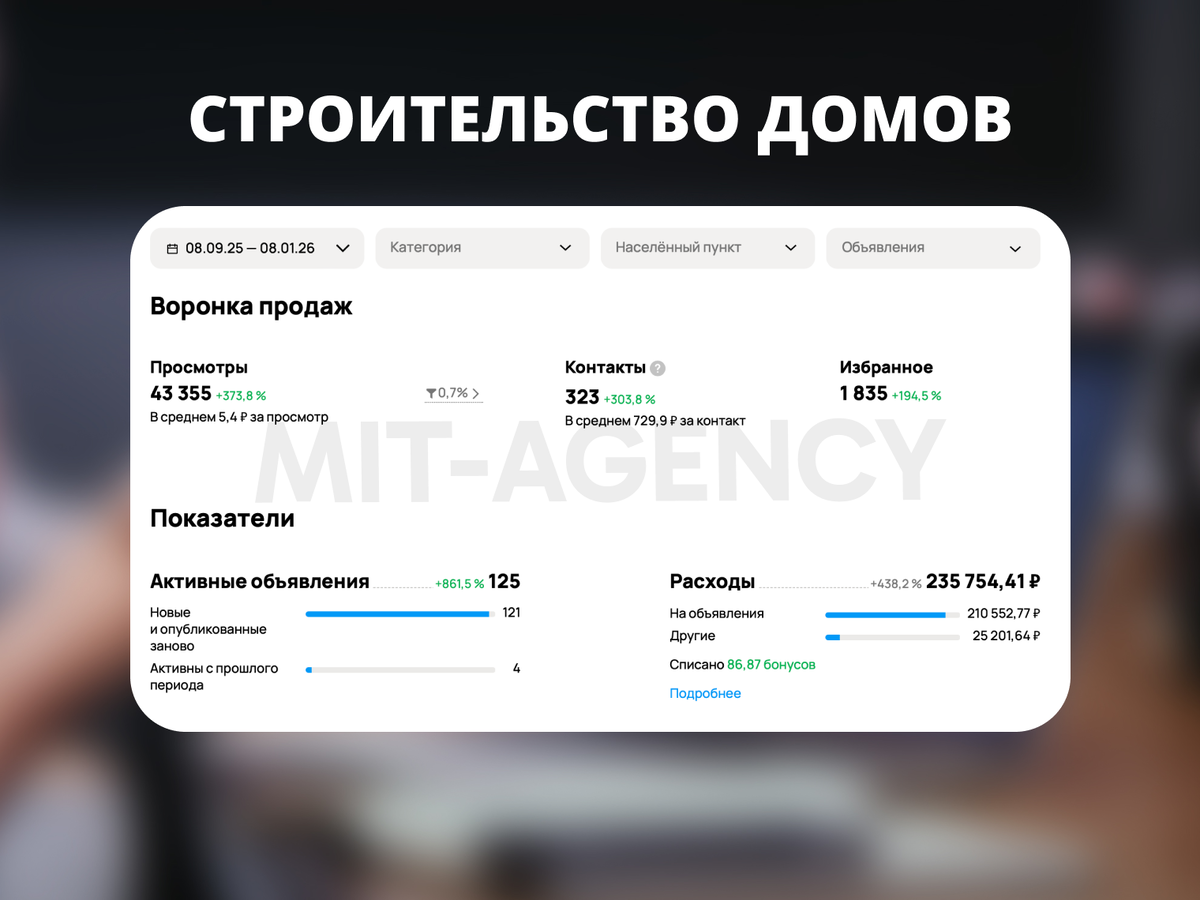 Всем привет! MIT Agency - реклама на Авито, которая приносит прибыль. Ниша строительства домов - одна из самых сложных на Авито. Здесь решения принимаются месяцами, клиенты возвращаются к сезону, а основная ценность Авито - это стабильный поток обращений и накопление базы потенциальных заказчиков. Задача - стабильно получать заявки и формировать очередь на сезон. - Почему в строительстве домов нельзя оценивать рекламу по принципу «сегодня запустили - завтра продали»