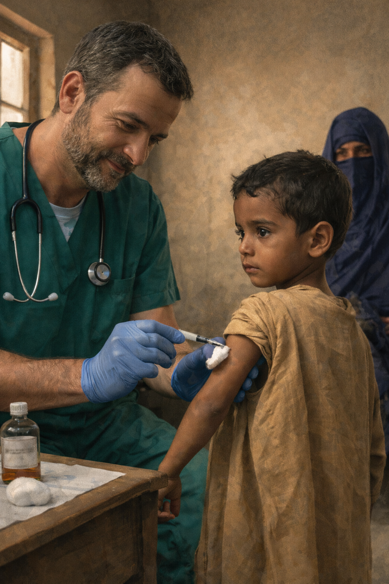 Рафаэль приглашающе, открытой ладонью – жест, который должен был говорить «я безоружен, я друг», – поманил маленького пациента к себе. Мальчик, не мигая, смотрел на него своими огромными, как маслины, черными глазами, в которых отражался яркий свет из окна. Затем медленно, почти церемониально, с недетской серьёзностью, обернулся к матери. Та сидела на стуле у входа, завёрнутая в индиговые ткани, и лишь её глаза, блестящие из-под накидки, были живыми точками в неподвижном лице. Она едва заметно, почти недвижно, кивнула – движение столь малое, что его можно было и не уловить. Но ребёнок сумел. Только после этого, получив разрешение, он сделал твёрдый шаг вперёд, нарушив линию шеренги.