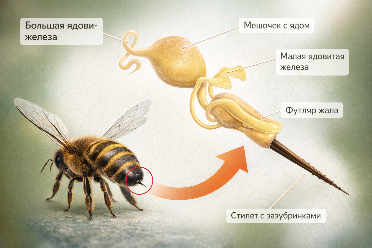 Пчела, защитившая свой улей, обречена. Одно ужаливание — и через несколько часов она погибнет. Оса в той же ситуации улетает невредимой и готова атаковать повторно. Эта разница кажется несправедливой, пока не разберёшься в устройстве жалоносного аппарата. За простым вопросом «почему?» скрывается история эволюционного компромисса между эффективностью оружия и ценой его применения. Жало перепончатокрылых насекомых — не самостоятельный орган, а радикально переделанный яйцеклад. Именно поэтому жалить способны только самки. У рабочих пчёл и ос репродуктивная функция редуцирована, а бывший яйцеклад превратился в инструмент защиты. Трутни — самцы пчёл — полностью лишены этого оружия. Сам аппарат устроен как микроскопический шприц с механическим приводом. Он включает непарный стилет и два ланцета — тонкие стержни, скользящие по направляющим желобкам. Ланцеты движутся попеременно, как миниатюрные пилы, углубляя жало в ткань жертвы. В основании аппарата находится резервуар с ядом и мышцы, нагнет