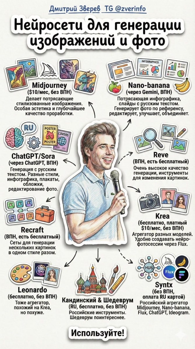 Выше на инфографике много вариантов, а ниже - мой личный топ-3 на данный момент (все часто меняется): ✔️ Midjourney для стилизованных картинок моего проекта Здесь своя особая эстетика и картинки Миджорни, конечно, получаются удивительными 😁 ✔️ Nano-banana для инфографики, комиксов, слайдов, обложек, редактирования Использовать эту нейросеть Google можно как в оригинале (через Gemini), так и через огромное количество сервисов-посредников, в том числе без всяких сложностей с регистрацией и оплатами. ✔️ Krea для нейросетевых снимков по обученной модели Вариантов создания своей модели также очень много, но именно Krea мне нравится тут больше всего в плане интерфейса и удобства. Подробнее про нейро-картинки и фото в моей новой почти 1000-страничной книге здесь Как вам? 🔥 — Присоединяйтесь к моему Telegram-каналу- там много практичных постов по инфомаркетингу. Дмитрий.