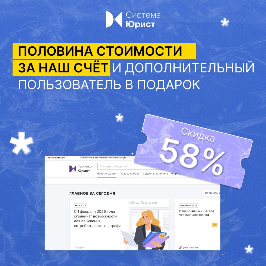 Редакция Системы Юрист совместном с действующими судьями и экспертами ФССП уже разъяснила, как судиться с учетом новых правил. 💡 А еще с Системой Юрист вы сможете: ⁃ быстро принимать взвешенные решения с помощью правовых заключений с риск-анализом; ⁃ переложить часть рутинных задач на плечи экспертов Системы Юрист; ⁃ иметь под рукой обзоры свежей судебной практики и изменений законодательства с комментариями экспертов. ↖️ Оставьте заявку по ссылке, чтобы подписаться на Систему Юрист со скидкой 58% до конца января и получить в подарок абонемент на закрытые юридические мероприятия. 📄 Менеджер свяжется с вами в течение дня, покажет самые важные правовые заключения, и поможет с оформлением подписки.