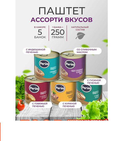 Ассорти набор паштетов Perva представляет собой идеальное сочетание пяти разных видов паштета, упакованных в одну удобную коробку объемом 250 граммов. Каждый вид паштета изготовлен из высококачественных ингредиентов, обеспечивая насыщенный вкус и аромат. Набор включает пять различных сортов паштета: **масло**, **гусь**, **индейка**, **курица** и **говядина**. Рассмотрим подробнее особенности каждого вида. ## Состав набора - **Масляный паштет**: нежный и мягкий продукт, идеально подходящий для завтраков и закусок. - **Гусиный паштет**: обладает выраженным вкусом и ароматом, прекрасно сочетается с хлебом и овощами. - **Индейка**: диетическое мясо птицы придает паштету легкий вкус и тонкий аромат. - **Курица**: классический вариант, любимый многими благодаря своему мягкому вкусу. - **Говяжий паштет**: богатый белком и железом, отличается приятным мясным вкусом. ## Преимущества продукта 1. **Удобство упаковки**: компактная коробка позволяет легко хранить и транспортировать паштеты. 2. **