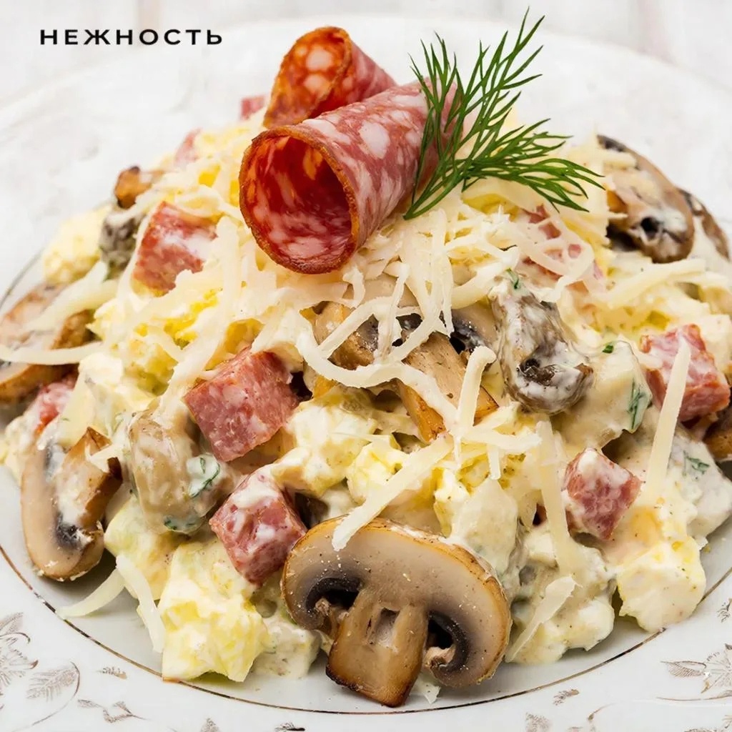 Предлагаю салат «Нежность», который порадует любителей грибов и копчёностей.
