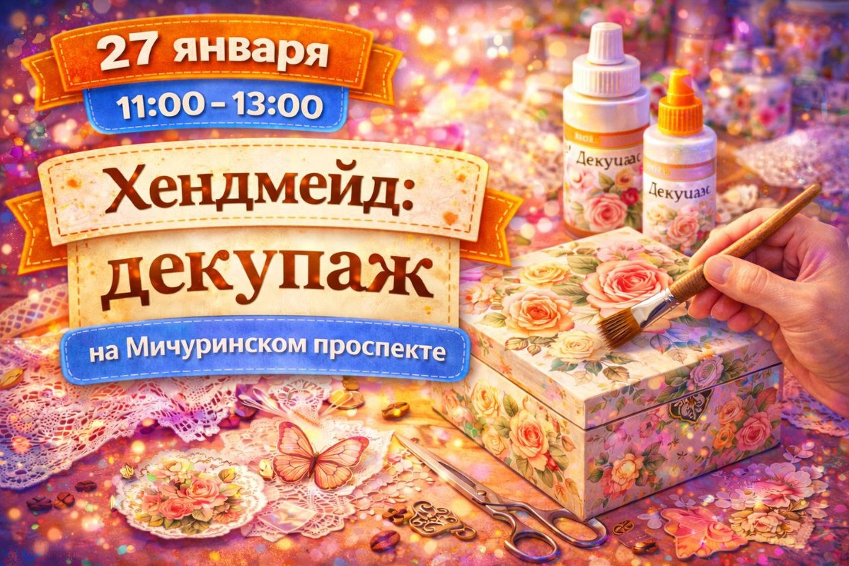 🧵 Хендмейд: декупаж Приглашаем вас на уютный мастер-класс по декупажу в арт-студии «Смарт» ✨ На занятии вы познакомитесь с одной из самых популярных техник декоративно-прикладного искусства и создадите красивый предмет интерьера своими руками. Мы научим правильно подбирать изображения, работать с поверхностью, наносить слои и создавать эффектные декоративные детали. Мастер-класс подойдёт как для начинающих, так и для тех, кто уже пробовал себя в творчестве. Это прекрасная возможность сделать оригинальный подарок или стильное украшение для дома. 📍 Арт-студия «Смарт», Мичуринский проспект 🕚 11:00–13:00 🎁 Готовую работу вы заберёте с собой 📌 Количество мест ограничено, запись обязательна 👉 Чтобы записаться, напишите администратору студии 📱 в ТГ Смарт Мичуринский