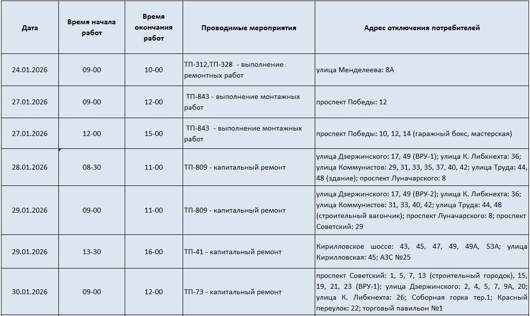 ❗Основные отключения придутся на центр Череповца утром 28 и 29 января