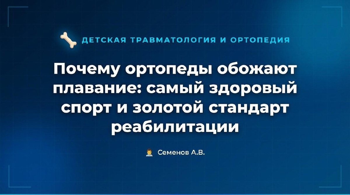 #детская_ортопедия 👋 Привет, друзья! На связи Андрей Семенов. 👨⚕️ 🔥 Если бы ортопедам разрешили «выписывать» один универсальный вид спорта — это почти всегда было бы плавание. Не по привычке, а по науке. 📊 Статистика говорит сама за себя: у регулярно плавающих детей и взрослых риск травм опорно-двигательного аппарата в 3–5 раз ниже, чем в ударных и контактных видах спорта. 🔬 Всё дело в физике воды. В бассейне тело попадает в условия «изменённой гравитации». 🟡 Закон Архимеда: при погружении по шею эффективный вес тела составляет около 10–15% от реального. 🦴 Это означает почти полное снятие осевой нагрузки с позвоночника, коленей и голеностопов. 🟡 Нет ударов — нет микроповреждений хряща. ⚡️ По данным ортопедических исследований, риск микротравм суставных поверхностей в воде ниже до 90–95% по сравнению с бегом. ✏️ Почему именно плавание мы используем раньше других видов спорта в реабилитации? ✏️ 🛠 После травмы или операции главная задача — как можно раньше включить мышцы,