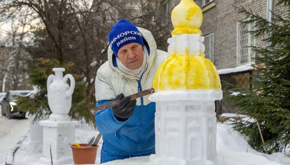 Скульптор и таксист Владимир Кузьмич создал впечатляющую снежную копию Никольского собора у себя во дворе в Санкт-Петербурге