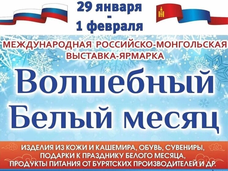29 января в Улан-Удэ начнёт работу Международная российско-монгольская выставка-ярмарка «Волшебный белый месяц». Она пройдёт в Физкультурно-спортивном комплексе на ул. Рылеева, 2 и будет работать до 1 февраля. На ярмарке представят продукцию более 100 российских и монгольских производителей и мастеров. В ассортименте — одежда, текстиль, изделия из кожи и шерсти, товары для дома, сувениры ручной работы и продукты для здоровья. Мероприятие позиционируется как место для выбора осмысленных подарков к празднику Белого месяца (Сагаалгану) и поддержки местных ремесленников. Ярмарка проводится в рамках национального проекта «Эффективная и конкурентная экономика», направленного на поддержку малого и среднего предпринимательства. Автор: Татьяна Олзоева