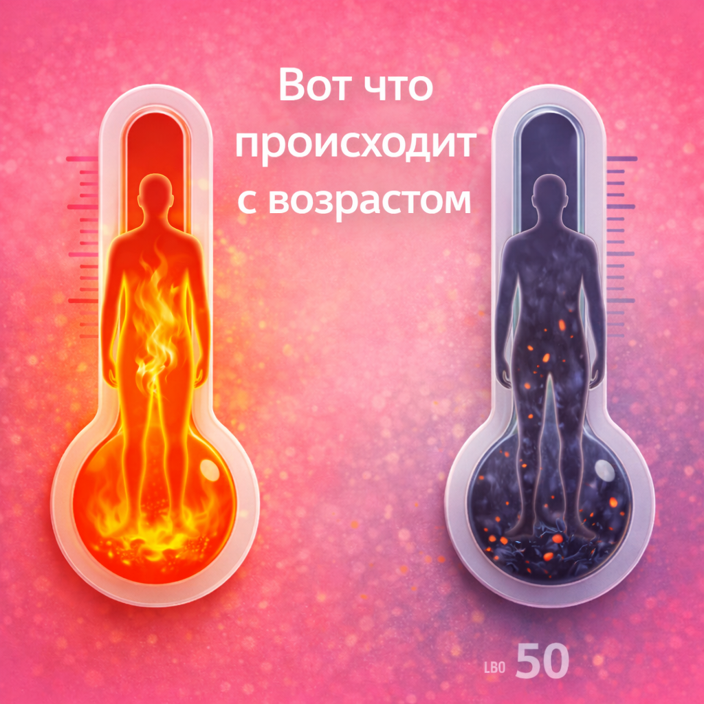 «Метаболизм — это как печка внутри. Чем быстрее она работает, тем больше тепла выделяет. С возрастом печка тормозит. После 40 лет — минус 5-7% скорости обмена веществ каждые 10 лет. Меньше "горит" — меньше тепла».