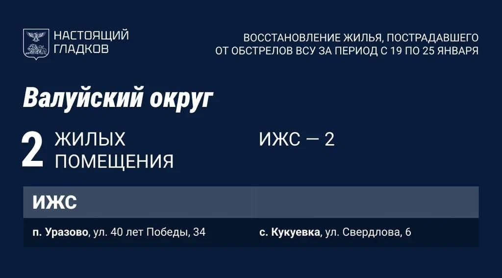 В Валуйском округе закончены 2 дома, повреждены 2 жилых помещения.