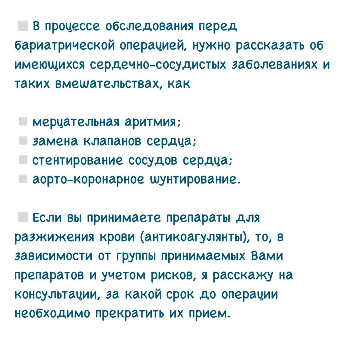 ?» Продолжаю отвечать на ваши вопросы. ➡️ Да, можно, но будет необходима консультация и заключение нашего кардиолога, который готовит таких пациентов к бариатрической операции. В некоторых случаях может потребоваться расширенное кардиологическое обследование, чтобы выявить и минимизировать все риски. ◽️Бариатрическая хирургия приводит к улучшению состояния практически при всех заболеваниях сердца и сосудов, включая: 📍высокое артериальное давление; 📍нормализация уровня холестерина; 📍нарушение липидного состава крови; 📍гипертрофия миокарда, сердечная недостаточность; 📍сосудистые заболевания (артерий и вен), заболевания коронарных сосудов (ишемическая болезнь сердца). ❗️Не забудьте также сообщить, какие препараты для лечения заболеваний сердца и сосудов Вы принимаете. Остались вопросы? Пишите!