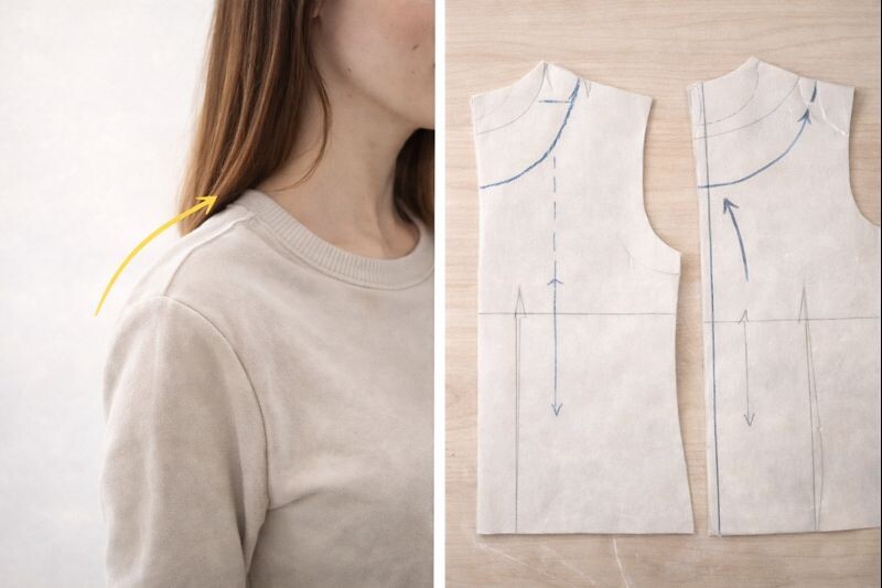 Частая причина: длина горловины и направление натяжения ткани не совпали с вашей посадкой, плюс возможна проблема с балансом плеча/переда/спинки.