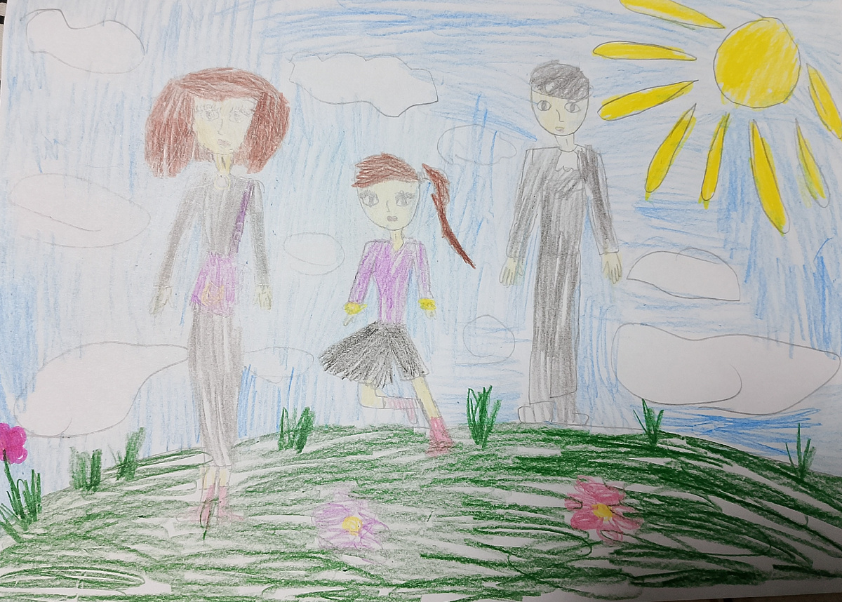 Мама, Катюша и папа на прогулке - вполне себе идиллический сюжет. Если не включить "режим психолога" и не начать придирчиво всматриваться в детали)) Об этом рисунке я уже рассказывала - в предыдущем посте "Когда оживают фото". Нейросеть воплотила задумку семилетней художницы в жизнь: