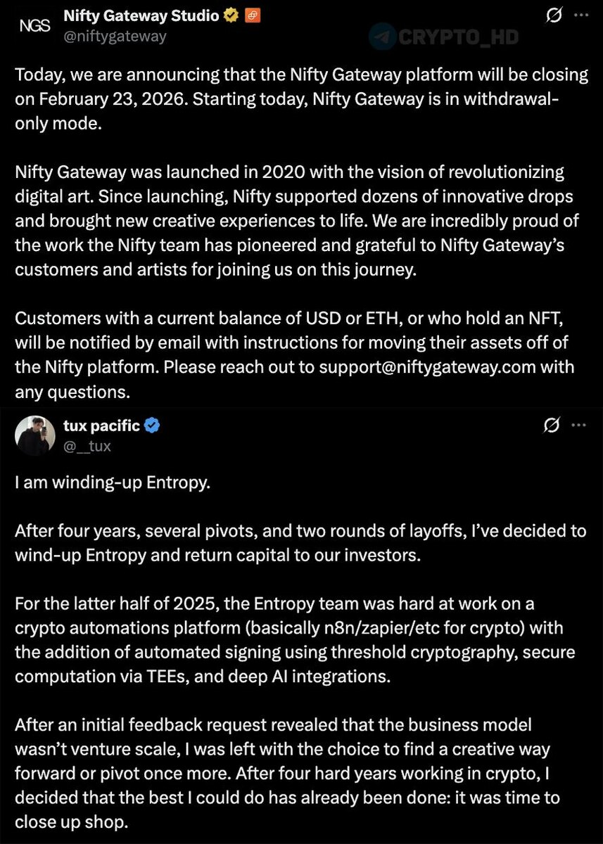 β’ Π Nifty Gateway, NFT-ΠΌΠ°ΡΠΊΠ΅ΡΠΏΠ»Π΅ΠΉΡΠ΅, ΠΏΡΠΈΠ½Π°Π΄Π»Π΅ΠΆΠ°ΡΠ΅ΠΌ Gemini, ΠΎΠ±ΡΡΠ²ΠΈΠ»ΠΈ ΠΎ Π·Π°ΠΊΡΡΡΠΈΠΈ ΠΏΠ»Π°ΡΡΠΎΡΠΌΡ. Π Π°Π±ΠΎΡΠ° Nifty Gateway Π±ΡΠ΄Π΅Ρ ΠΏΠΎΠ»Π½ΠΎΡΡΡΡ ΠΏΡΠ΅ΠΊΡΠ°ΡΠ΅Π½Π° 23 ΡΠ΅Π²ΡΠ°Π»Ρ 2026 Π³ΠΎΠ΄Π°, ΠΏΠ»Π°ΡΡΠΎΡΠΌΠ° ΡΠΆΠ΅ ΠΏΠ΅ΡΠ΅Π²Π΅Π΄Π΅Π½Π° Π² ΡΠ΅ΠΆΠΈΠΌ ΡΠΎΠ»ΡΠΊΠΎ Π²ΡΠ²ΠΎΠ΄Π° ΡΡΠ΅Π΄ΡΡΠ². β’ ΠΡΠΈΠΏΡΠΎΡΡΠ°ΡΡΠ°ΠΏ Entropy, ΠΏΠΎΠ΄Π΄Π΅ΡΠΆΠΈΠ²Π°Π΅ΠΌΡΠΉ Andreessen Horowitz (a16z), ΡΠ°ΠΊΠΆΠ΅ ΠΎΠ±ΡΡΠ²ΠΈΠ» ΠΎ Π·Π°ΠΊΡΡΡΠΈΠΈ ΠΈ Π²ΠΎΠ·Π²ΡΠ°ΡΠ΅ ΠΊΠ°ΠΏΠΈΡΠ°Π»Π° ΠΈΠ½Π²Π΅ΡΡΠΎΡΠ°ΠΌ. ΠΠ° ΡΠ΅ΡΡΡΠ΅ Π³ΠΎΠ΄Π° ΠΏΡΠΎΠ΅ΠΊΡ ΡΠ°ΠΊ ΠΈ Π½Π΅ ΡΠΌΠΎΠ³ Π½Π°ΠΉΡΠΈ ΠΌΠ°ΡΡΡΠ°Π±ΠΈΡΡΠ΅ΠΌΡΡ Π±ΠΈΠ·Π½Π΅Ρ-ΠΌΠΎΠ΄Π΅Π»Ρ ΠΈ ΡΡΡΠΎΠΉΡΠΈΠ²ΡΠΉ ΡΠΏΡΠΎΡ Π½Π° ΠΏΡΠΎΠ΄ΡΠΊΡ. Entropy Π±ΡΠ» Π·Π°ΠΏΡΡΠ΅Π½ Π² 2021 Π³ΠΎΠ΄Ρ, ΠΏΡΠΈΠ²Π»Π΅ΠΊ $25m ΠΈΠ½Π²Π΅ΡΡΠΈΡΠΈΠΉ ΠΎΡ a16z ΠΈ Coinbase Ventures, Π° Π² 2025 Π³ΠΎΠ΄Ρ ΠΏΡΡΠ°Π»ΡΡ ΡΠ°Π·Π²ΠΈΠ²Π°ΡΡΡΡ ΠΊΠ°ΠΊ ΠΏΠ»Π°ΡΡΠΎΡΠΌΠ° ΠΊΡΠΈΠΏΡΠΎ-Π°Π²ΡΠΎΠΌΠ°ΡΠΈΠ·Π°ΡΠΈΠΉ Ρ AI-ΡΠ΅Ρ