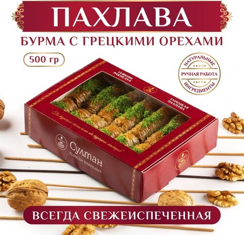 Традиционные восточные сладости всегда привлекают внимание своим изысканным вкусом и ароматом. Если вы хотите порадовать себя и близких настоящим кулинарным удовольствием, обратите внимание на специальный набор, включающий две знаменитые азербайджанские сладости: **бакинскую пахлаву весом 700 грамм** и **бурму с грецкими орехами массой 450 грамм ("Султан")**. Что такое бакинская пахлава? Это легендарное блюдо азербайджанской кухни, известное своей слоистой структурой и богатым вкусом. Оно изготавливается вручную из тонких слоев теста, щедро пропитанных медом и начиненных смесью измельчённых грецких орехов и сахара. Особенностью бакинской пахлавы является хрустящее тесто и приятный сладкий вкус, дополненный лёгкой пряностью корицы и кардамона. Чем особенна бурма с грецким орехом? Бурма — ещё одно классическое восточное угощение, которое понравится поклонникам десертов с ореховым вкусом. Она состоит из тонкого слоеного теста, обжаренного в масле и наполненного свежими грецкими орехами.