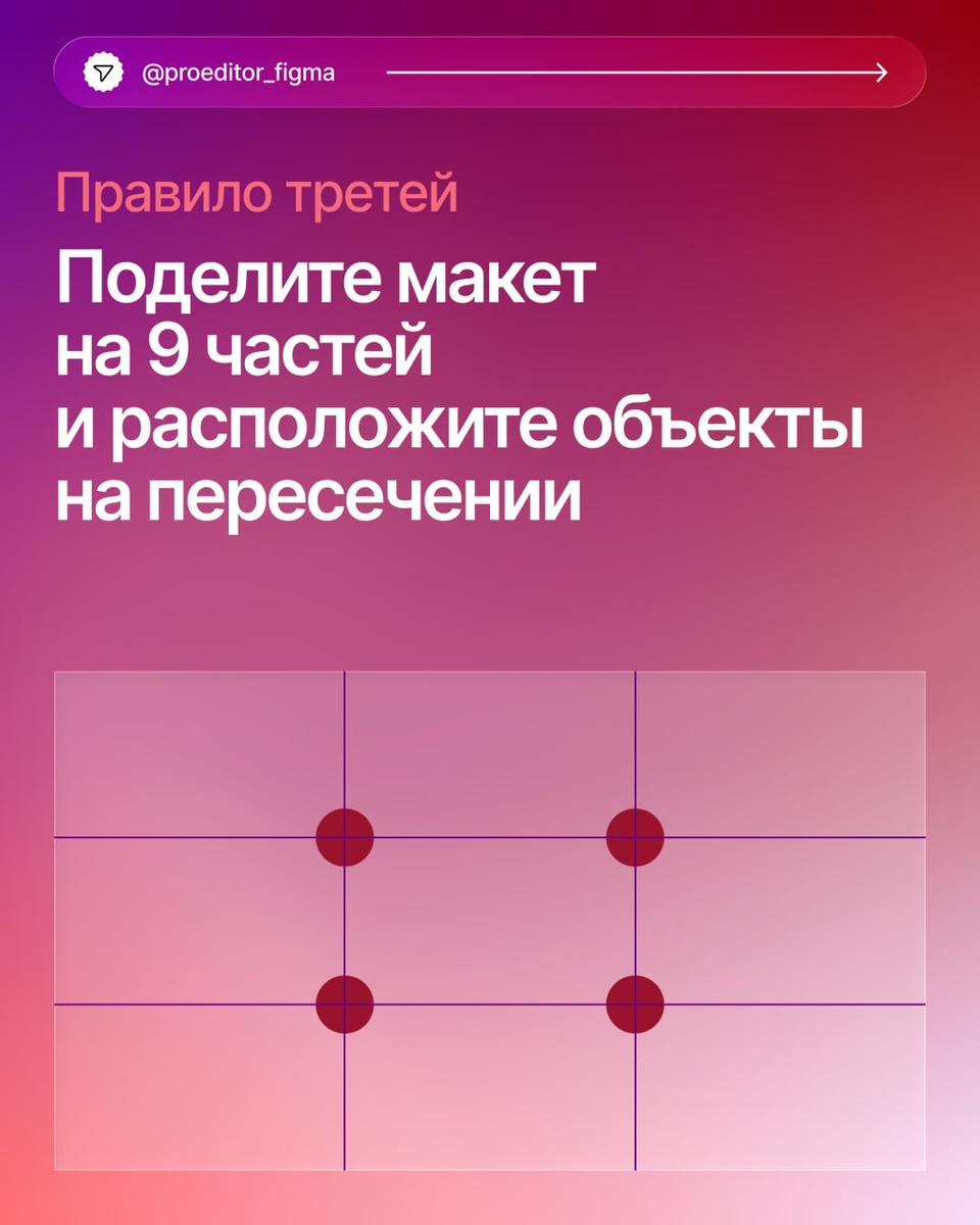 Когда перед вами стоят разрозненные элементы, то очень тяжело придумать, как их расположить на макете. Может быть, заголовок поставить посередине, кнопку под ним, а описание запихнуть в левый верхний угол? Или же расставить всё по углам по правилу якорных объектов? А если от себя придумать композицию? Правило третей — ещё один мощный помощник при создании композиции. Как его видеть в чужих работах и применять в своих, читайте в карточках 👆 #полезное