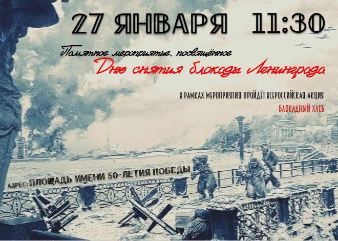 27 Января приглашаем жителей и гостей города на Площадь 50-Летия Победы на памятное мероприятие посвященное Дню снятия блокады Ленинграда.