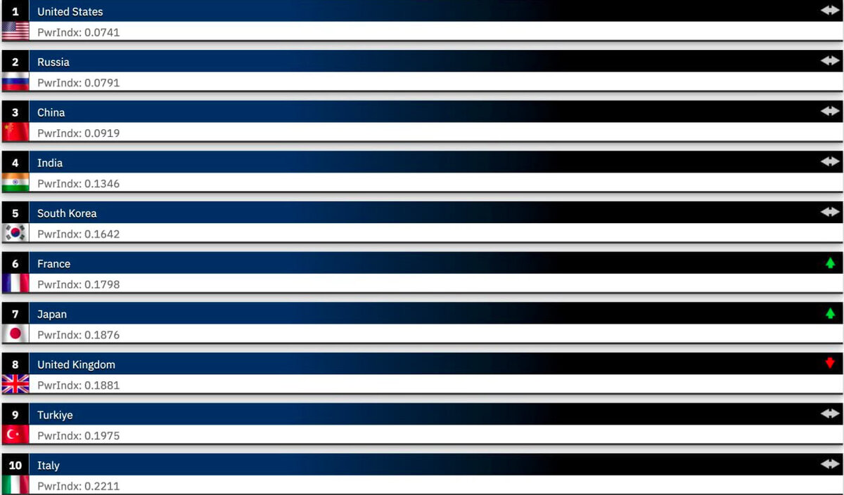 Первое место у США, третье у Китая. Рейтинг учитывал более 60 показателей: финансовая ситуация в стране, географическое положение, логистические возможности и другие. Всего в шорт-листе указаны 145 государств. Отмечается, что состав первой пятерки не изменился с предыдущего года. Рейтинг Global Firepower составляется с 2005 года.