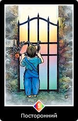 Итак, Вы чувствуете себя посторонним. Это хорошо. Это переходный период. Теперь Вам нужно быть бдительным, чтобы не чувствовать боли и страдания. Теперь, когда нет Бога, кто Вас утешит? Вам не нужны утешения. Человечество вышло из этого возраста. Будьте мужчиной, будьте женщиной и стойте на своих собственных ногах. Единственный путь соединиться с существованием – это идти вовнутрь, потому что в центре Вы остаетесь связанными. Вы были физически отделены от своей матери. Это разъединение было совершенно необходимо, чтобы сделать Вас самостоятельной индивидуальностью. Но Вы неотделимы от вселенной. И Ваша связь с вселенной исходит из сознания. Вы не можете этого видеть. Поэтому Вам нужно идти глубоко внутрь с огромной осознанностью, бдительностью, свидетельствованием. И тогда Вы найдете эту связь. Будда – это связь! Маленький ребенок, изображенный на этой карте, стоит за калиткой, глядя сквозь нее. Он так мал; он убежден, что не может пройти через нее, и не видит, что калитка не заперта