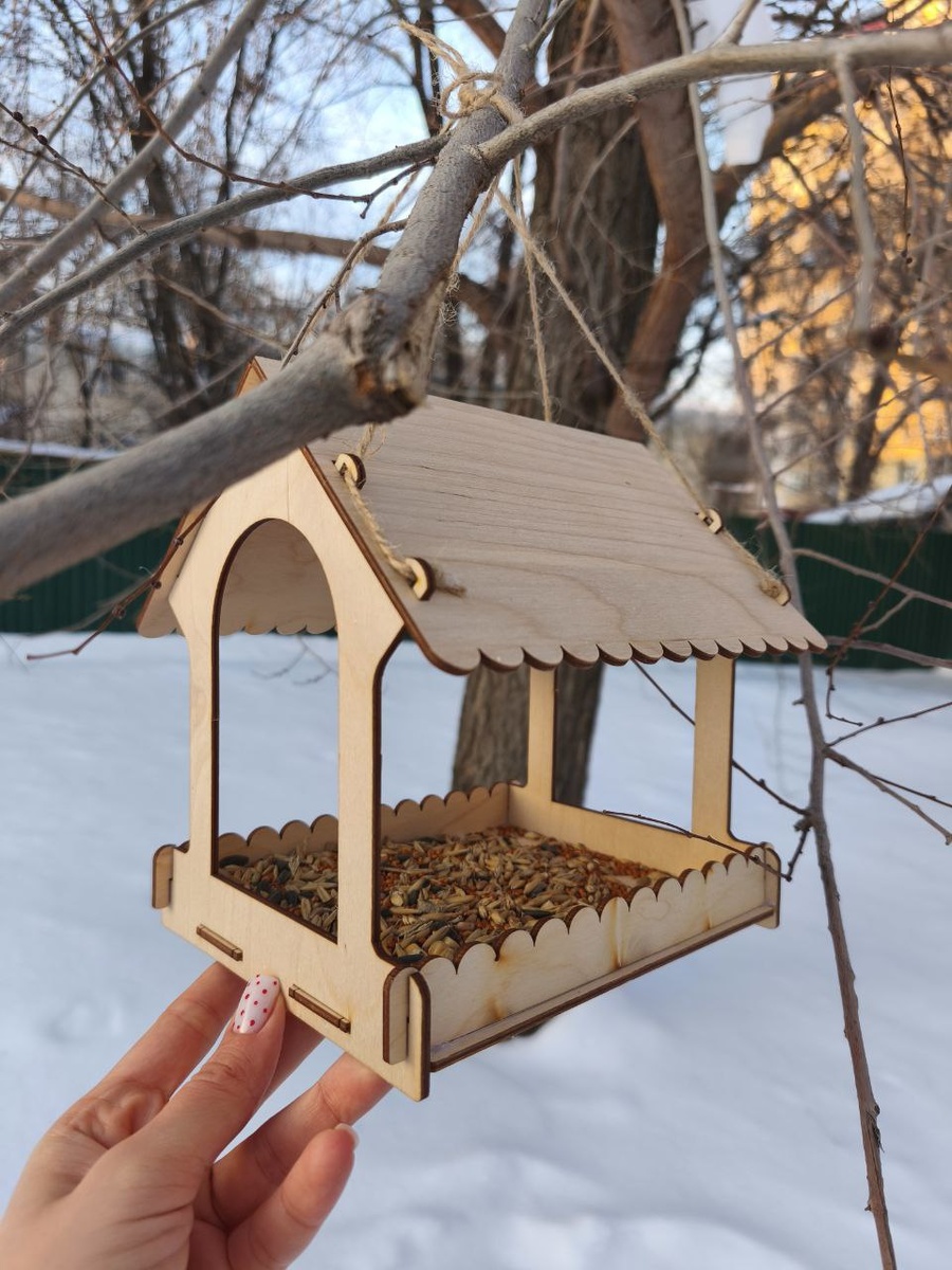 на ozon заказала кормушку и специальный корм, потому что, оказывается, уличных птиц нельзя кормить хлебом — это слишком тяжелая пища для них