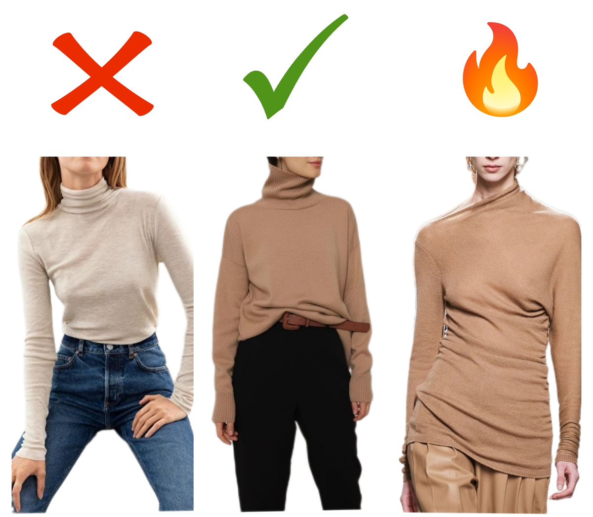 ❌Водолазку прошлого сезона легко распознать по тонкой ткани и потерявшей форму вытянутой горловине.