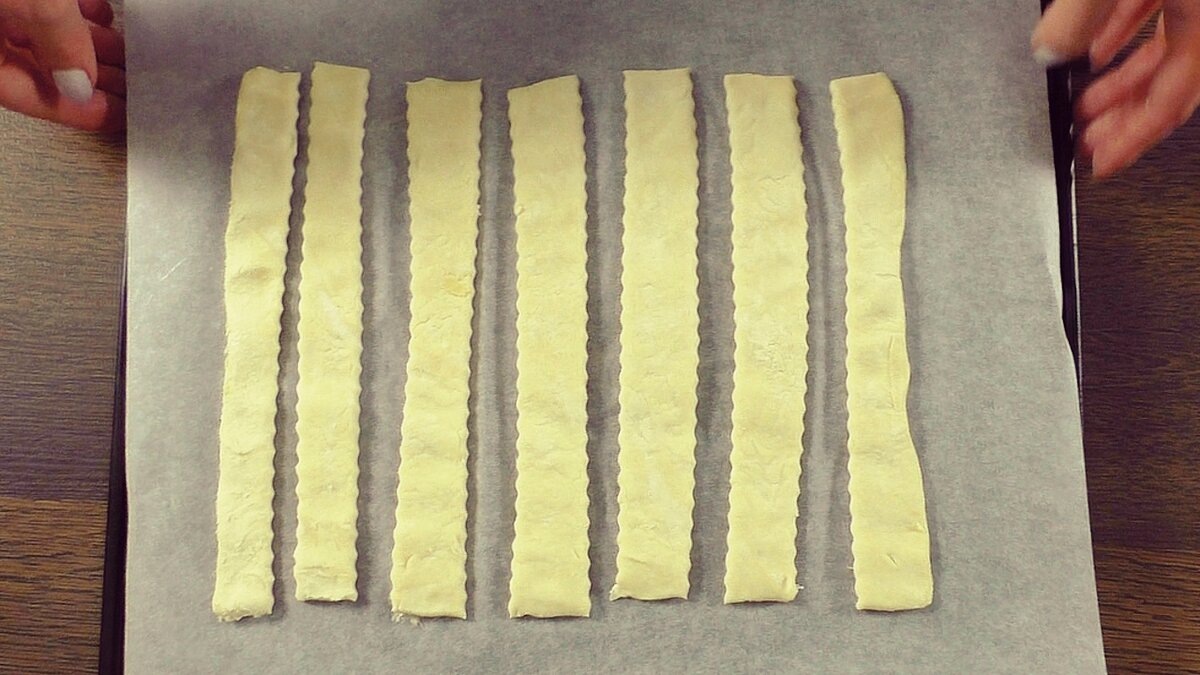 Тесто лучше не раскатывать, а лишь разморозить, немного растянуть пальчиками и нарезать на полоски шириной примерно 1,5 см.