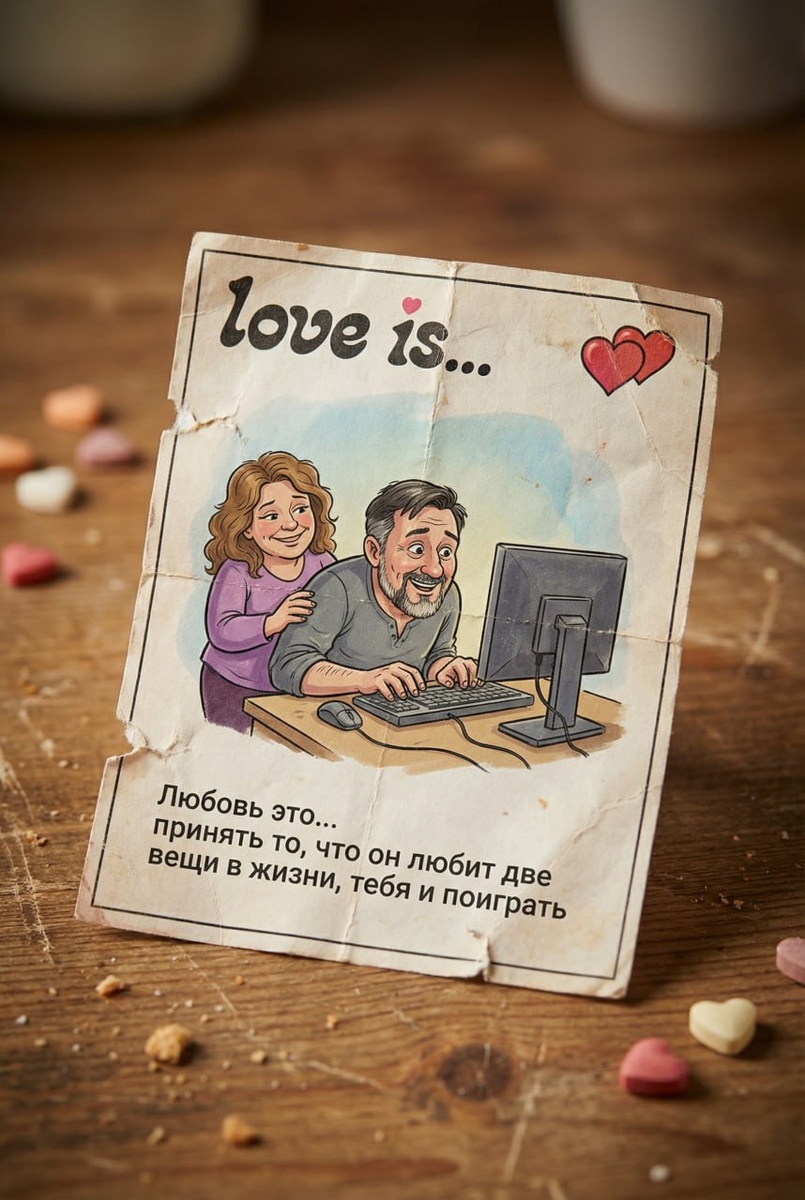 Продолжаем тему винтажных вкладышей Love is... — теперь с забавными фразами и сценами. Если в прошлом посте была романтика и объятия, то здесь — реальная жизнь пары с долей иронии. Он сидит за компьютером и играет, она рядом — улыбается с пониманием. Слегка мультяшная иллюстрация в стиле оригинальных вкладышей, но с вашими чертами лица. 🧠 Промпт для бытовой сцены: "Гиперреалистичное, детализированное фото винтажного вкладыша от жевательной резинки "Love is...", слегка мультяшная иллюстрация милой пары в домашней обстановке, он сидит за компьютером, увлечённо играет, девушка сидит рядом, улыбается с пониманием, забавная надпись о любви: "Любовь это... принять то, что он любит две вещи в жизни, тебя и поиграть". Изображение должно выглядеть как реальное фото физического вкладыша на столе. Высокое разрешение, профессиональное студийное освещение, малая глубина резкости, тема Дня святого Валентина." 💡 Практическая польза: Иногда самые честные признания в любви — это принятие странно