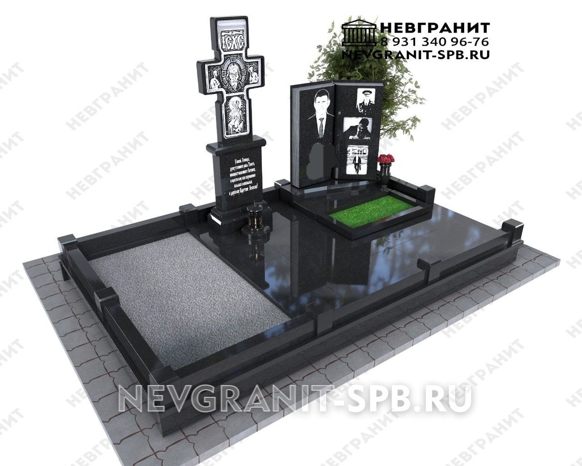 2. Светская история (Книга жизни): Справа установлен уникальный памятник в форме раскрытой книги. Это мощный символ завершенного земного пути. На одной «странице» расположен парадный портрет, а на другой — кадры из жизни: человек в военной форме, моме