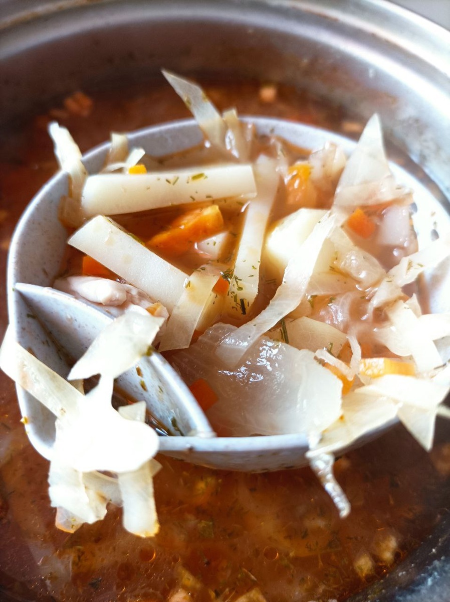 В дополнение обычно были помидоры, огурцы. В несезон они свежие как пластилин, поэтому перешла на закатки. Покупные, естественно. Не самое лучшее, но дает свои вкусовые нотки.