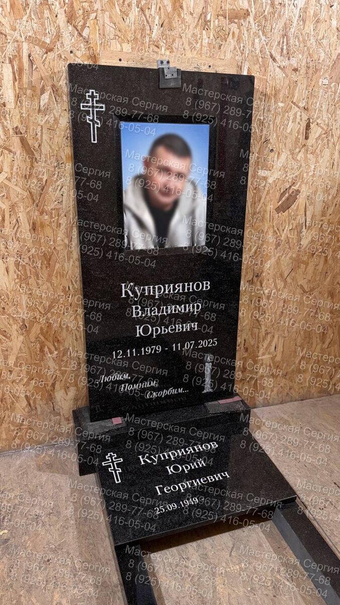 Вся работа выполнена из чёрного натурального гранита Габбро-Диабаз. Этот камень ценят за высокую прочность и устойчивость к погодным условиям, глубокий насыщенный чёрный цвет и возможность зеркальной полировки, которая сохраняется годами. Зеркальная полировка подчёркивает строгость формы и придаёт памятнику ухоженный, законченный вид. Все элементы комплекс
