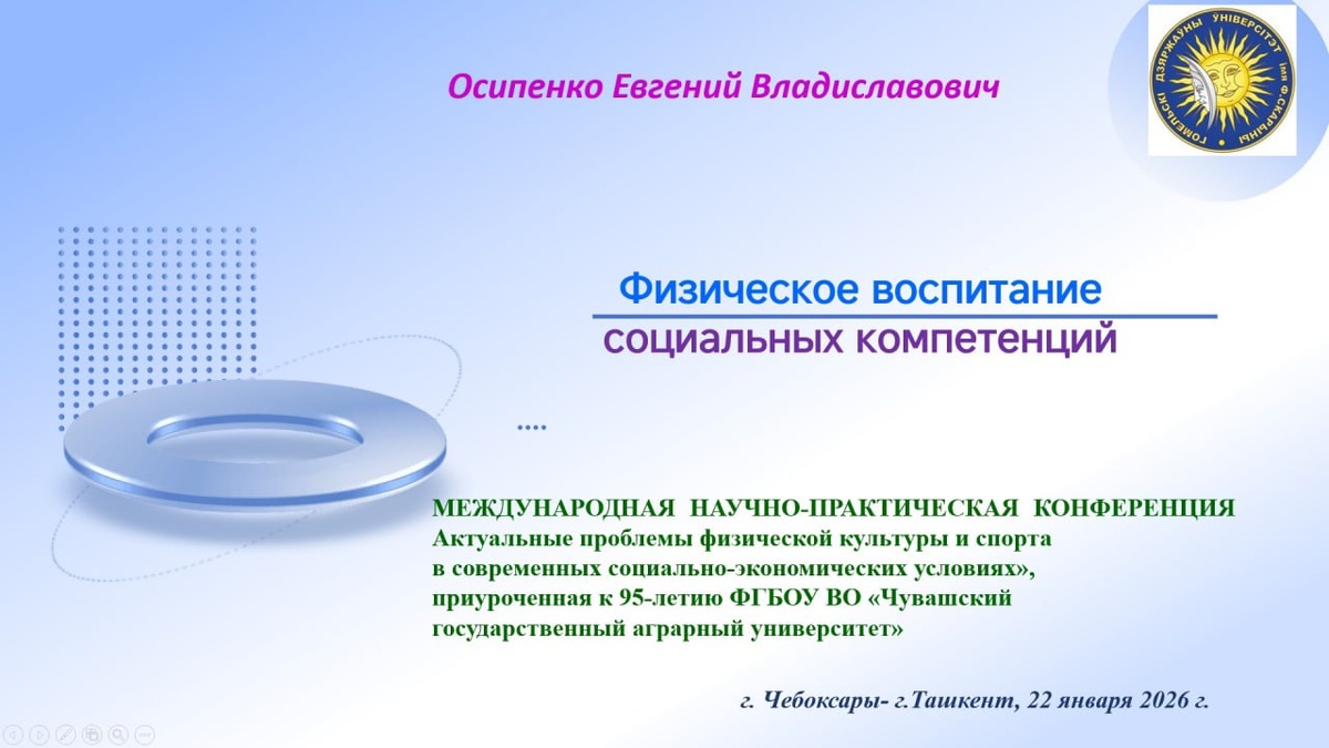 📍22 января кафедра теории и методики физической культуры ГГУ выступила соорганизатором в международной научно-практической конференции «Актуальные проблемы физической культуры и спорта в современных социально-экономических условиях». 🖇 Мероприятие было приурочено к 95-летию Чувашского государственного аграрного университета и объединило экспертов из России, Узбекистана и Республики Беларусь. ✅ Наш университет представил заведующий кафедрой теории и методики физической культуры, кандидат педагогических наук, доцент Евгений Осипенко. Его научный доклад «Физическое воспитание социальных компетенций» вызвал живой интерес аудитории. 📌 Работа конференции продолжилась на 6 тематических секциях, которые охватили ключевые направления современной науки: от истории спорта и цифровой трансформации студенческого движения до инновационных педагогических технологий, медико-биологических аспектов и развития инклюзивной физической культуры в вузах.