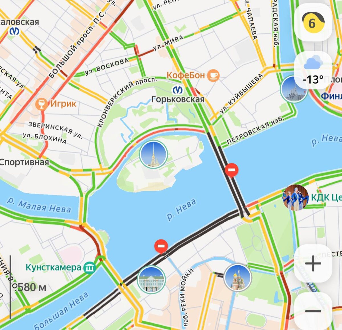 Утром 26 января в Петербурге без предупреждения закрыли движение по набережной канала Грибоедова, Думской улице, Конюшенной площади, Приморскому проспекту, Ушаковской и Выборгской набережным. Причина ограничений пока неизвестна. Несмотря на локальные перекрытия, общая дорожная обстановка в городе оценивается как удовлетворительная — четыре балла из десяти. Однако пробки наблюдаются на Дворцовой набережной, Кронверкском проспекте, Садовой и других магистралях. 📷: Яндекс карты Читай нас в MAX! | Читай нас в Telegram